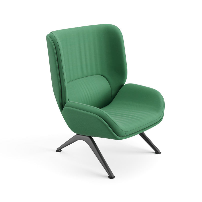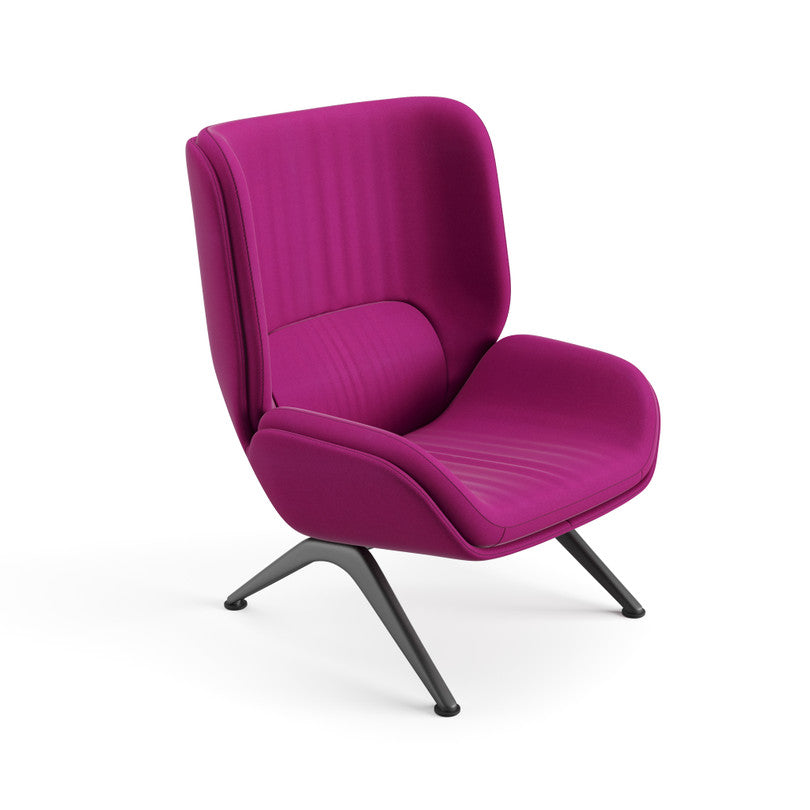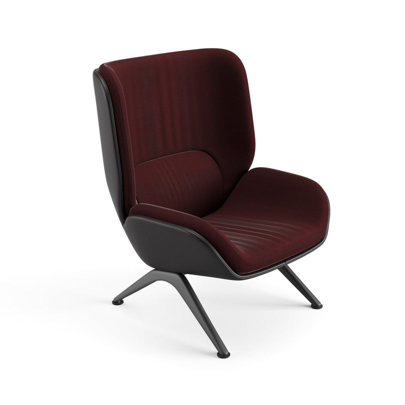 Lounge chair with a powdercoated aluminium base equipped with height-adjustable glides. Shell consisting of a wraparound polyurethane outer panel and inner cushions. The outer panel and the inner cushions are upholstered with different materials in specially designed combinations. The upholstery of the panel and cushions can be separated and replaced by technical personnel, since it is applied without the use of glue.