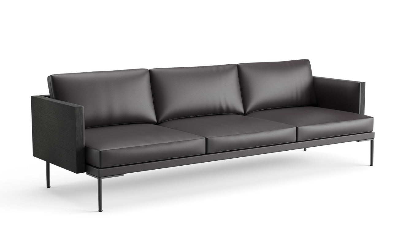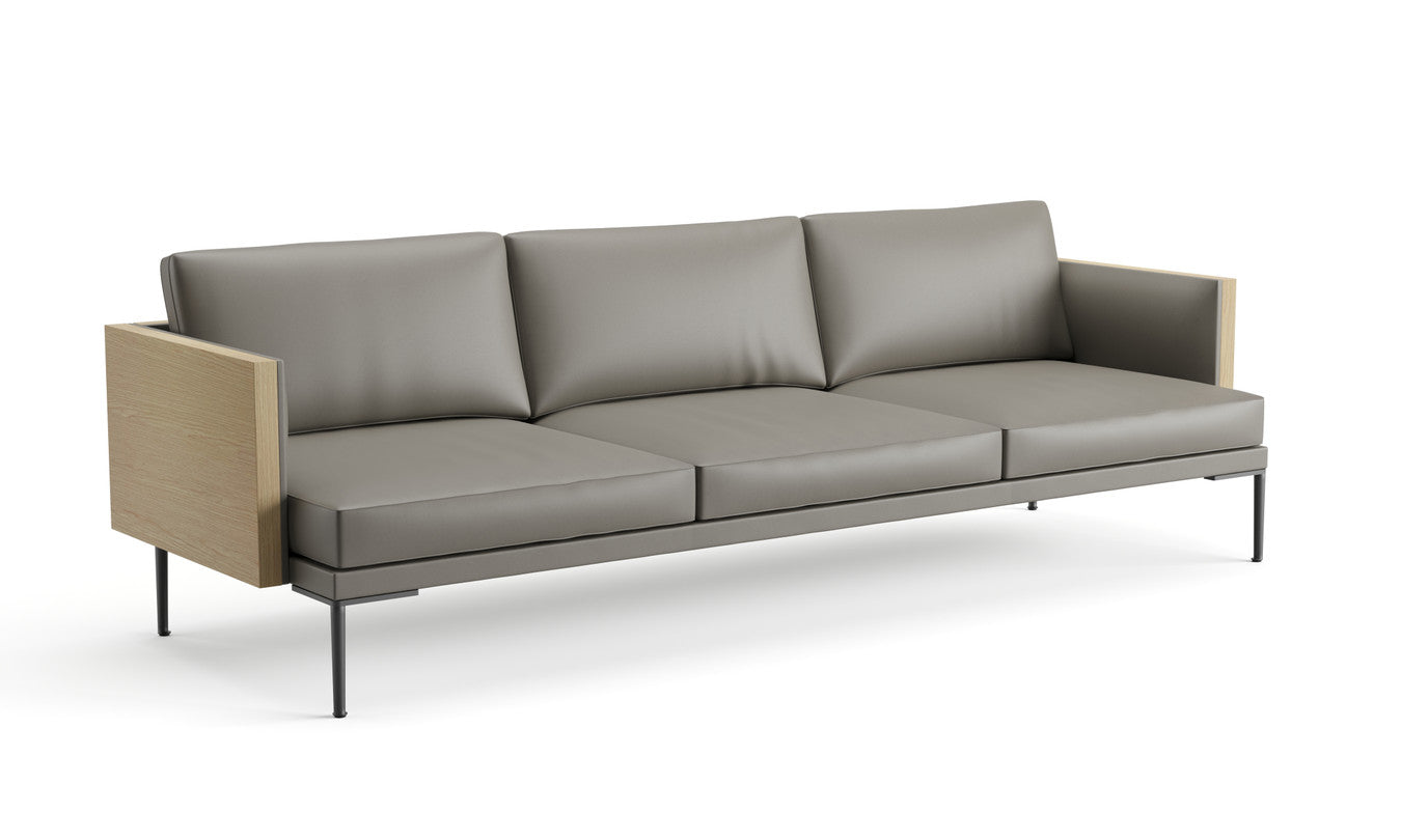 3-seater sofa with outer structure in reconstituted wood. The upholstery of the inner structure and of the seat and backrest cushions is available in the same material and colour, in fabric, leather, coated fabric or the customer’s choice of covering. The seat and backrest cushions have removable upholstery.
